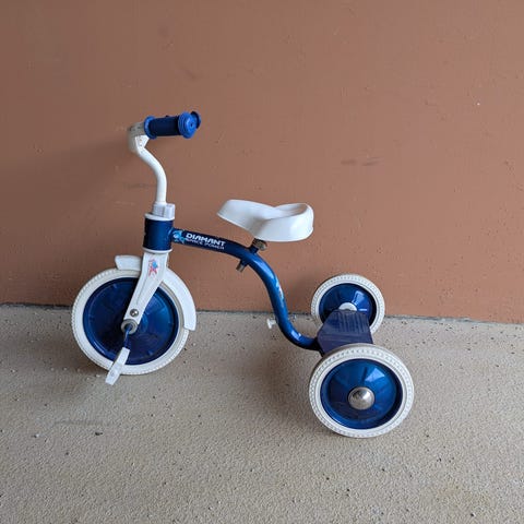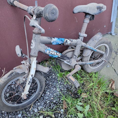 Barnesykkel med lilla ramme, skjermer og kurv foran og bagasjebrett. Behov for litt restaurering. Må hentes snarest! Kastes mandag 29/12.