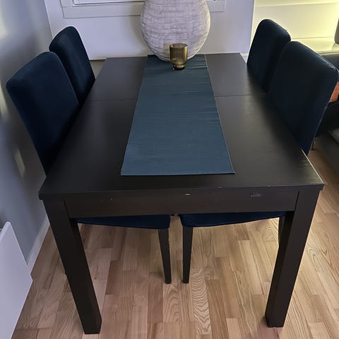 Ikea spisebord, Torsby, 180x85 cm. Bordplate i brunsort. Litt svelling i bordflaten, men fortsatt pent og god bruksverdi.