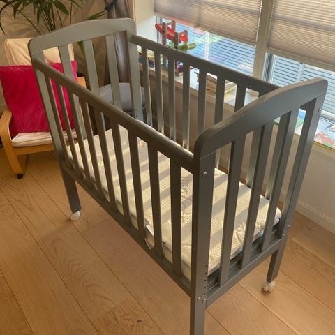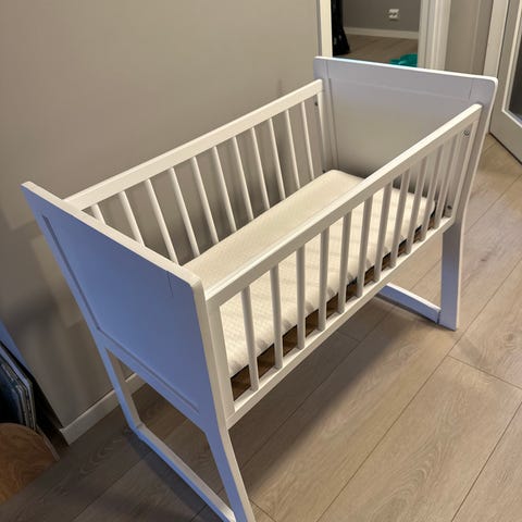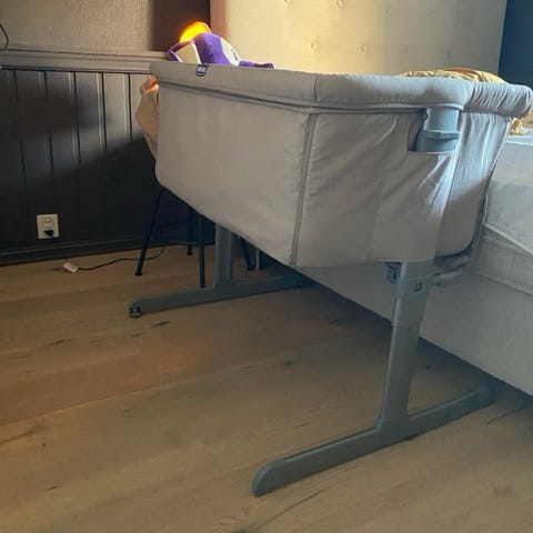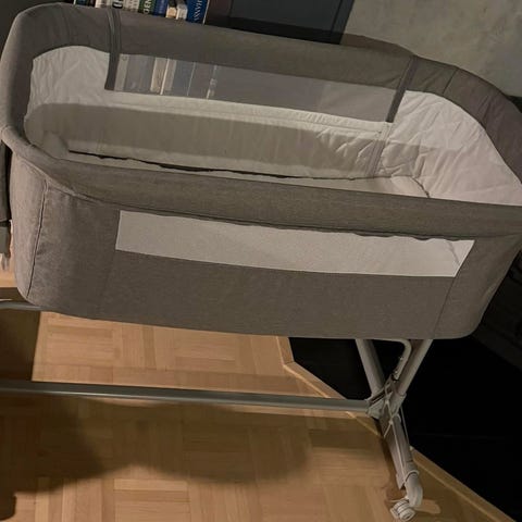 Gir bort en eldre Chicco bedside crib. Den er brukt og har litt flekker men det er mye bruk igjen. Den står i trekket sitt.