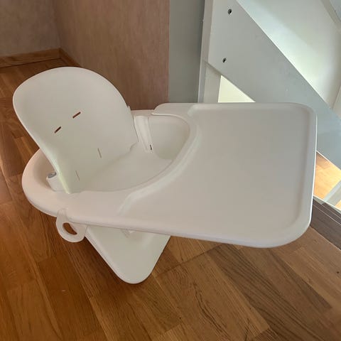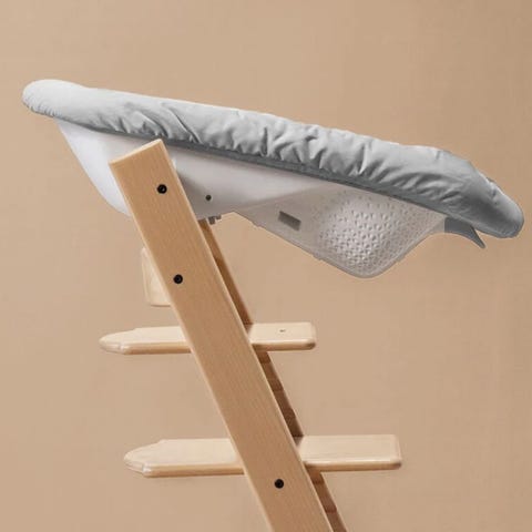 Stokke Newborn Seat med polstret sete og sikkerhetssele, passer til Stokke Tripp Trapp. Designet for baby, vi brukte det til hun var 6 måneder. Da er det lett å ha babyen til bords når familien skal spise, eller på kjøkkenet når hen vil følge med på det du holder på med. Setet har en myk, lys farge og er laget med materialer som gir støtte og beskyttelse for barnet. Vaskbart.