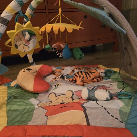 Babygym er brukt, men er mye bruk igjen. Tussi har bjelle i seg, Tigergutt lager musikk og sola er speil. Vimpel lager knitre lyd.