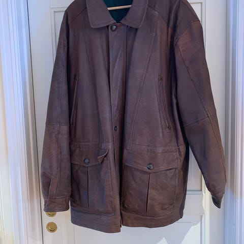 Side Leder skinnjakke i størrelse 58 svart farge. Jakken er laget av skinn og har glidelås foran. Den har lommer på sidene og ribbestrikkede kanter ved ermer og nederkant. Kjøpt i Side i Tyrkia og ikke brukt.