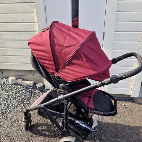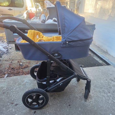 Britax barnevogn med grå trekk. Barnevognen har justerbart sete og stor oppbevaringskurv under. Den har fire hjul og håndtak med justerbar høyde. Vognen er godt brukt og har noen slitte skruer. Et par hjul er punktert. Litt vanskelige å skifte (grunnet slitte skruer), men egner seg godt som barnehagevogn. Har vært oppbevart i skur.