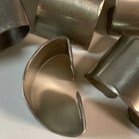 Stilige serviettholdere i tinn. Produsert i Norge, kjøpt hos en gullsmed i Finland i ca 1990. Aldri brukt. Diameter 4 cm.