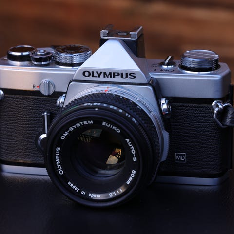Analogt Olympus OM-1 speilrefleks kamera, inkludert blitz. Kameraet ligger i et originalt skinnetui.
