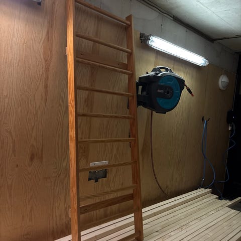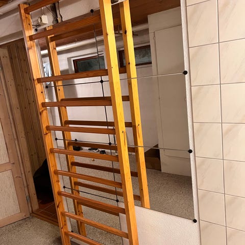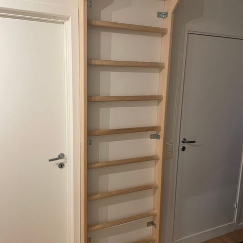 Selger en solid, hjemmelaget klatrevegg som passer perfekt til hjemmetrening. Veggen er bygget i kraftig kryssfiner og kan justeres i ulike grader (fra nær vertikal til tydelig overheng), noe som gir stor variasjon i treningen.