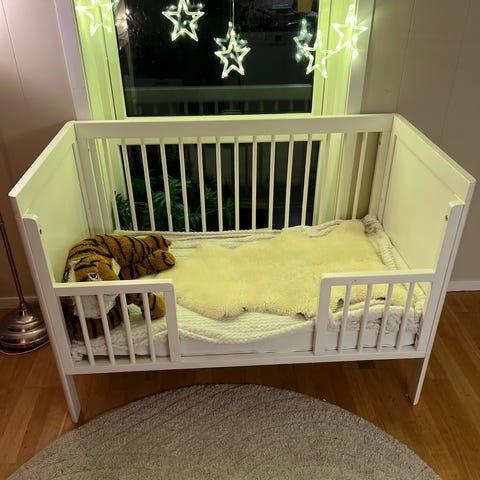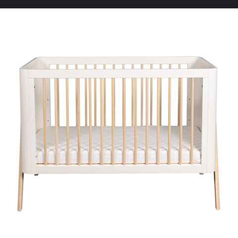 Bedside crib Oslo er en sideseng i et nytt, smart og trygt design. Den lange siden kan senkes, og sengens base kan justeres til ti forskjellige høyder. Hjul er inkludert. Tror den kanskje er en eldre modell men den har samme funksjoner. Er litt bruksmerker/maling som flasser av men det tenker man ikke over på avstand. Den var vår lifesaver i et par måneder. Madrass følger med.