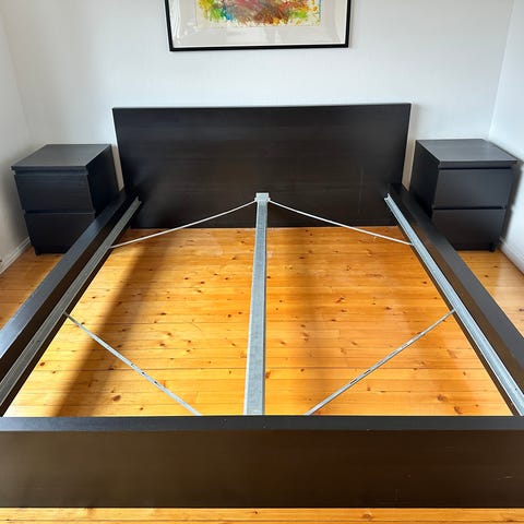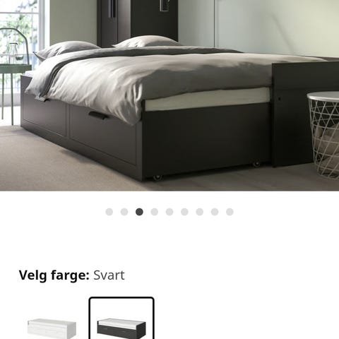 Jeg selger Brimnes-sengen min fra IKEA. Den ble kjøpt ny i 2021. Sengen inneholder fire oppbevaringsskuffer med god plass.