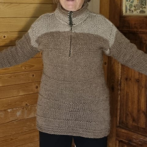 Hjemmestrikket hals med perlestrikk. Halsen har målene 34 x 24 cm når den ligger flatt.