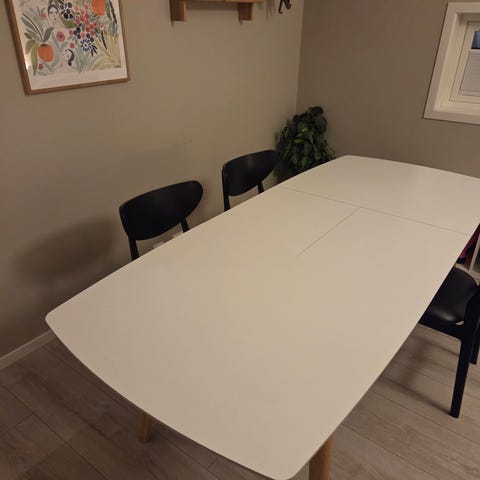 Godt brukt, men mykje bruk igjen. Eit brennmerke på bordplata, sjå bilde. Klaffene er 45 cm.