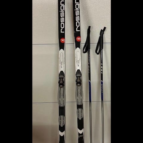 Komplett langrennsett med ski, støvler, staver og smøreboks.