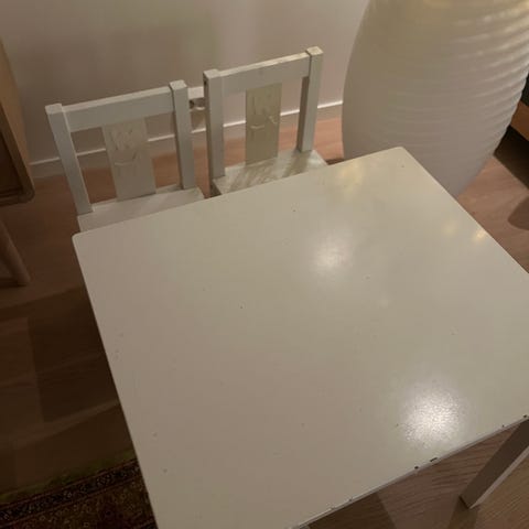 Godt brukte IKEA barnemøbler bestående av et bord med avtakbare bordplater, samt to hvite stoler med dekorative ryggstøtter. Bordet har integrert oppbevaringsrom med innsatsbrett i plast.