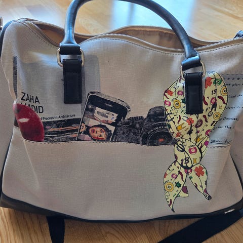 Håndveske med regulerbar skulderstropp fra Carpisa, kjøpt i Italia. Imitert skinn og tekstil.
