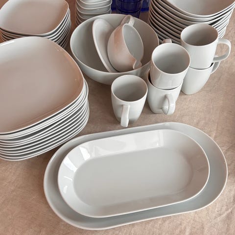 IKEA servise i hvitt porselen. Inkluderer tallerkener, skåler og kopper. Serviset er egnet for daglig bruk og kan brukes til servering av ulike måltider.
