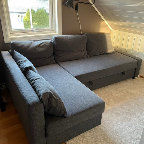 Veldig pen og lite brukt Backabro vendbar sovesofa fra IKEA, sjeselong-sovesofa med oppbevaring og avtagbare trekk på samtlige putter samt på selve sofaen. Trekk kan vaskes på vaskemaskin.