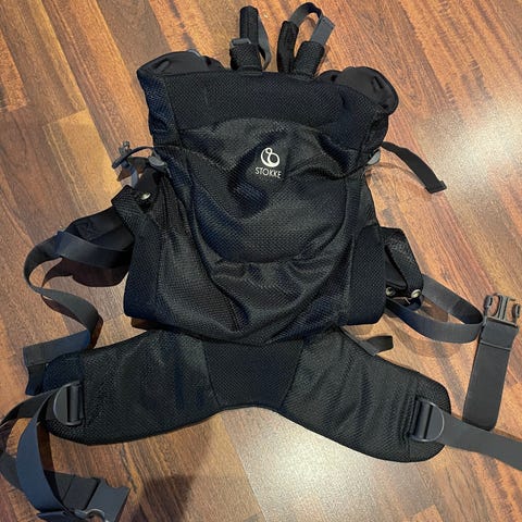 Stokke bæresele med mye bruk igjen. Kan bære foran og bak på rygg. Gode puter rundt hofter og store, solide klippser. Vekt er 3.5 kg og opp til 15 kg. Kan vaskes i maskin.