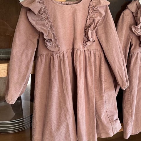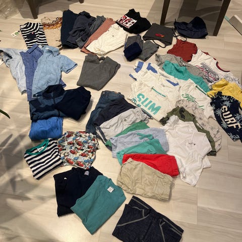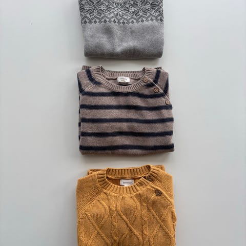 Genseren er str 110 /116, buksene er str 110. Den beige buksa har fått en bitteliten malingsprikk i gull (se bilde). Den grønne genseren med jungel mønster er lite brukt, den hvite noe mer, buksene er mest brukt, men har mye bruk igjen. Ingen flekker eller hull.