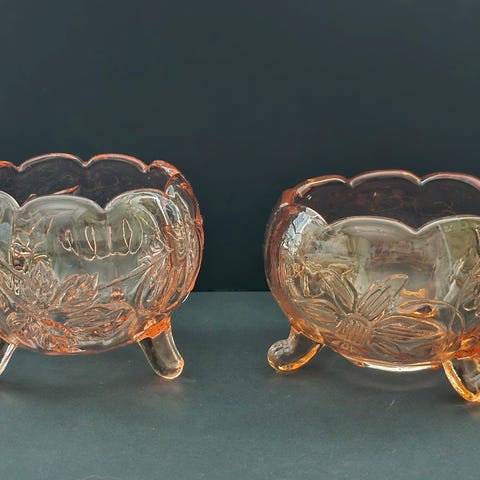4 stk fargede pressglass skåler i fagene lilla, blå, grønn og rosa.
