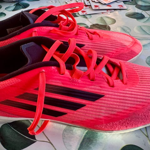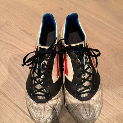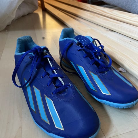 Adidas F50 fotballsko i hvit og blå farge. Skoene har snøring og gummisåle med mønster for godt grep. Egnet for bruk på innendørs og harde underlag. Lite og pent brukte av en 8 åring.