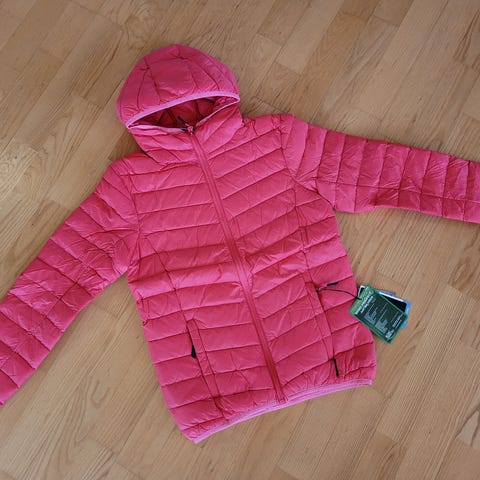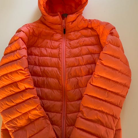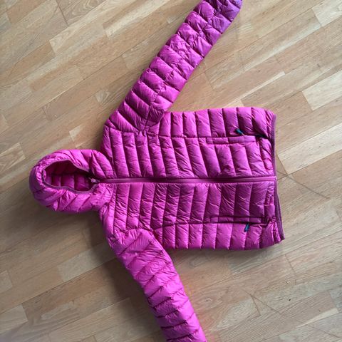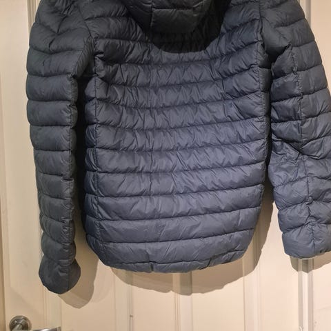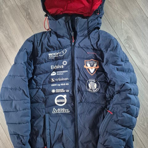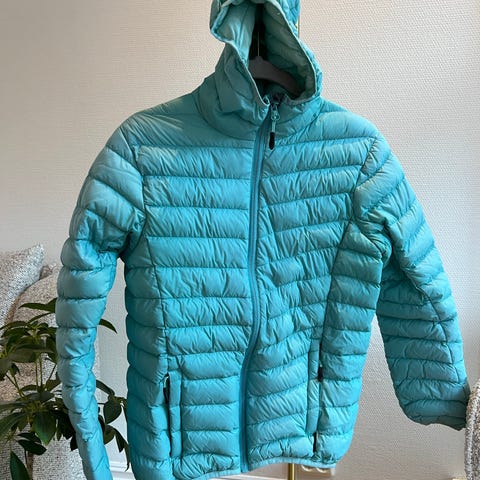 Brukt dunjakke fra Jotunheim. Det er noen små hull i stoffet nederst ved armene men om ikke det gjør noe så kan dette være en fin utelek jakke, for eksempel.