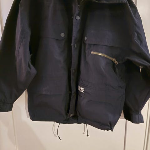 Sort/grå jakke. Bomull/polyester. Er en del år gammel, men fortsatt mye jakke igjen.