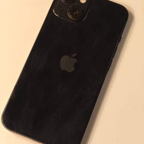 Pent brukt Apple iPhone 13 mobiltelefon med 128 GB lagringskapasitet i hvit farge. Gjenværende batterikapasitet 77%