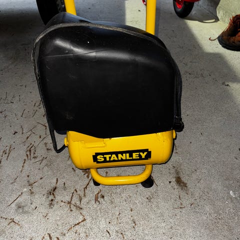 Kompressor med spikerpistol, malerspøyte, trykkluft og sandblåsing.