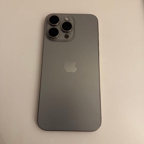 Apple iPhone 15 Pro Max mobiltelefon med 256 GB lagringskapasitet. Enheten har en skjerm med notch og tre kameraer på baksiden. Batteritilstanden viser 91 % kapasitet. Produksjonsdato er juli 2024, og første brukerdato er oktober 2024.