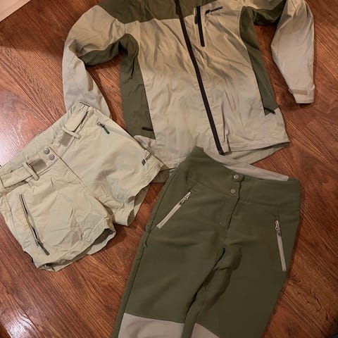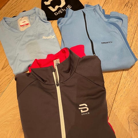 Tynn dunjakke (står M, men liten i størrelsen), gaupa turbukse, pulsvarmere og lue med Coca-Cola font av ull.