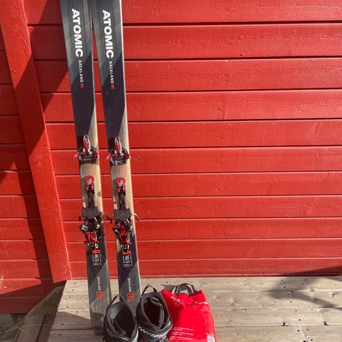 Selger min toppturpakke med Atomic Backland 95 ski (lengde 185 cm) og G3 Ion 12 bindinger, samt tilpassede G3 Universal-feller, da jeg må tynne ut i skiboden. Skarejern følger også med, noe som gjør pakken solid!