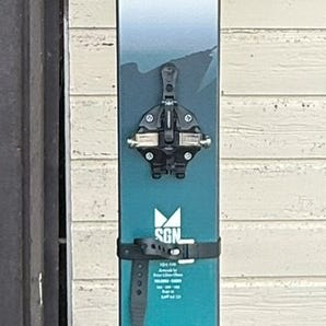 Skiene har alltid vært lagret med voks for å beskytte sålen, og det er ingen større riper, kun overflateriper som er å forvente. Bindingene er bunnsolide og tåler juling, men er lette nok til lengre turer. Disse er montert til mondo 27 (306), og har 22 mm justering. Fellene er universal i nylon, som er holdbare og passer til variert føre. Limet er fortsatt bra her. Skarejern er skarejern og er lurt å ha i sekken for skareføre. Ikke hver dag det er pudder…