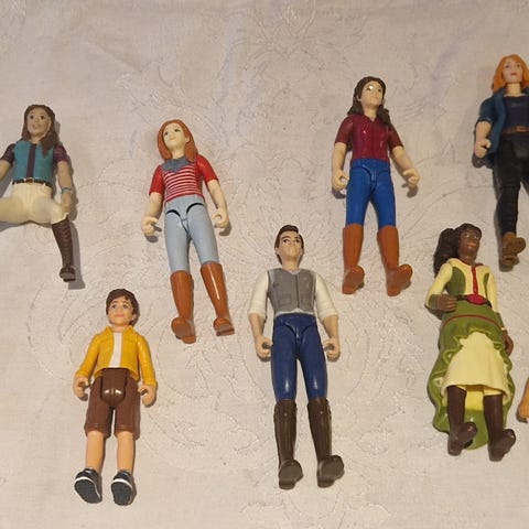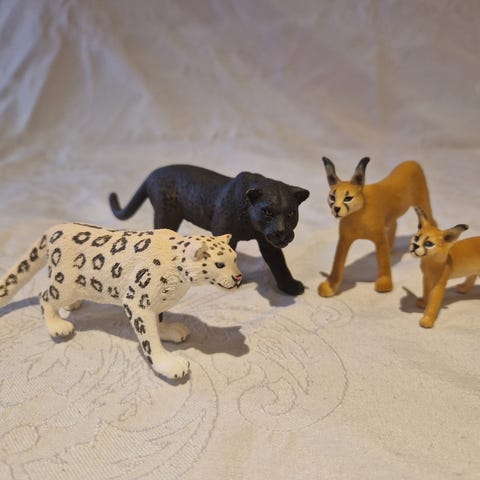 Samling av små kattefigurer laget i plast, med ulike farger og design. Figurenes størrelse varierer, og de viser forskjellige katteraser og posisjoner.