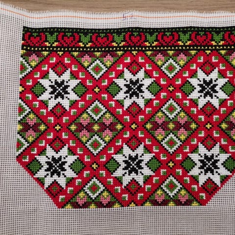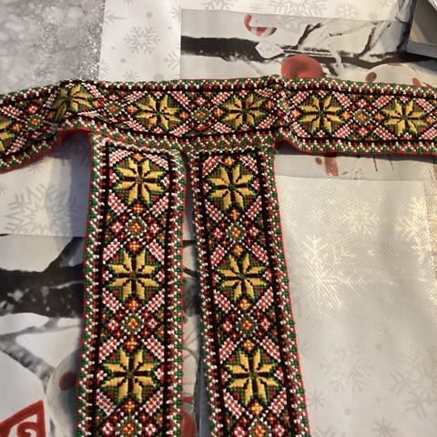 Umontert bringeduk. Følger med nummer på farger som er brukt dersom det er ønskelig å brodere belte. Brodert i korssting med innstikk av perler. Kjøper betaler evt frakt