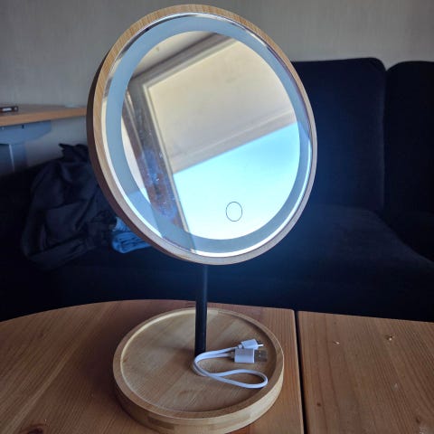 Selger et flott speil med belysning. Fikk det i julegave for 2 år siden, er ennå i god stand. Er mulighet til å enten ha batterier eller stikkontakt. Selges pga har ikke plass lenger. Send mld om det er noe du lurer på!