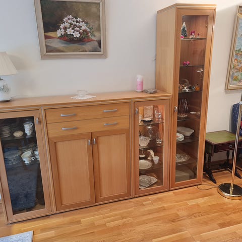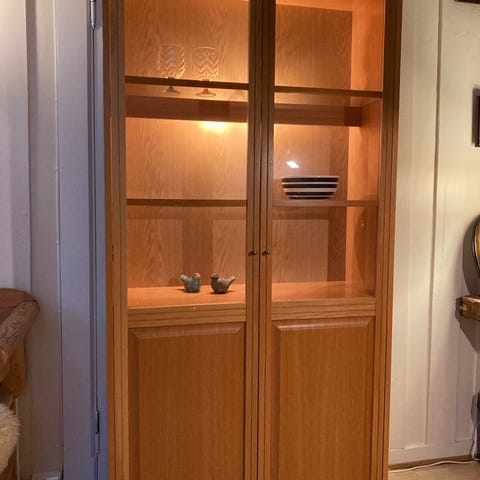 Vitrineskap i heltre eik med glassdører og glasshyller. I meget god stand. Skapet har en nedre skuff for oppbevaring og møbelet passer til visning og lagring av f. eks. glass og servise. Selges grunnet plassmangel.