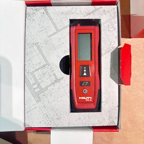 Hilti PR 30-HVS rotasjonslaser med medfølgende batteri. Produktet er designet for nøyaktige målinger og oppmåling i byggeprosjekter. Leveres i rød og svart farge.