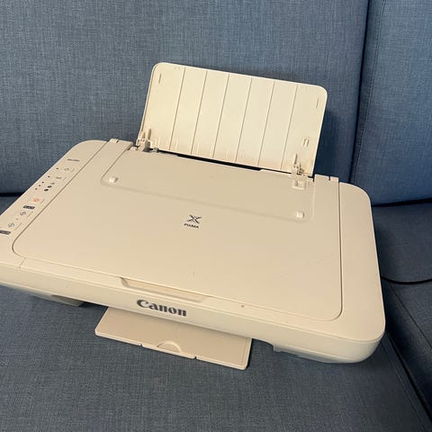 Gi bort HP DeskJet 3632 multifunksjonsskriver med funksjoner for utskrift, skanning og kopiering. Enheten har en blå og hvit fargekombinasjon og leveres med strømkabel og to små rammer. Passer til hjemme- eller kontorbruk. Alt fungerer som trenger.
