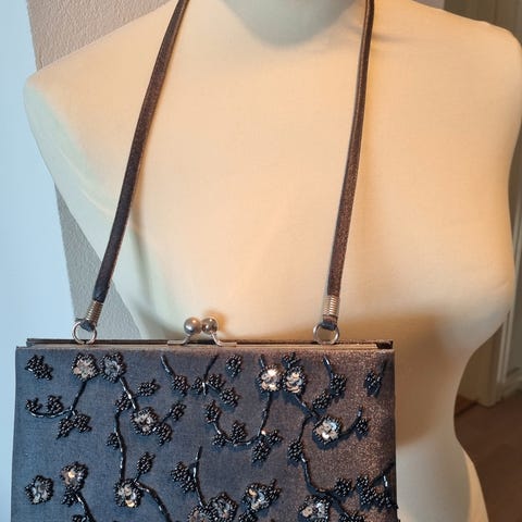 Fin veske med perler/paljetter i gull, sølv og sort. Kan brukes både med og uten skulderlenke. Som ny!