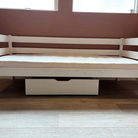 Skuff medfølger ikke. Det er et par bruksmerker på sengen (se bilde 13; øverste platå på trapp), ellers er sengen i god stand og klar for nye eiere.