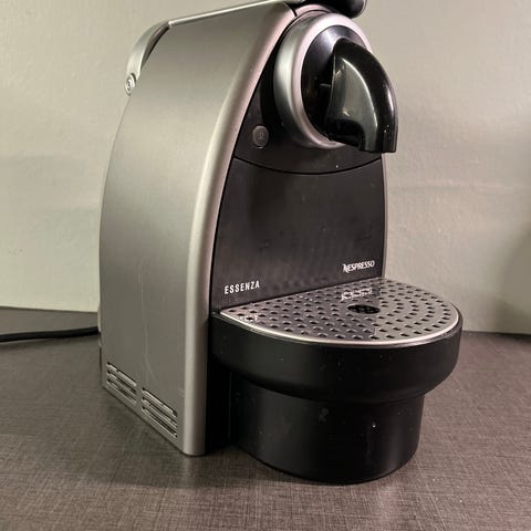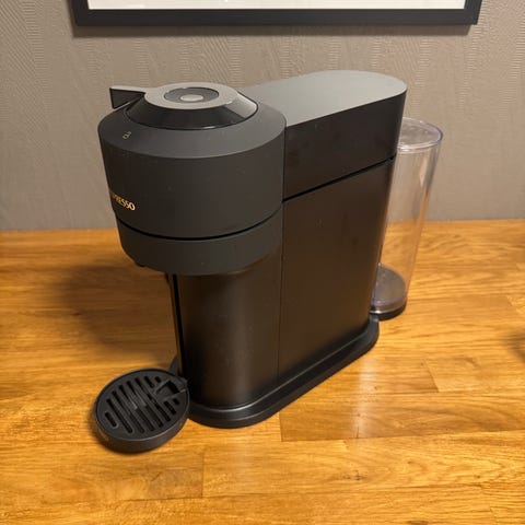 Svart Nespresso Vertuo kapselkaffemaskin. Maskina brukar kapslar for å lage kaffe.