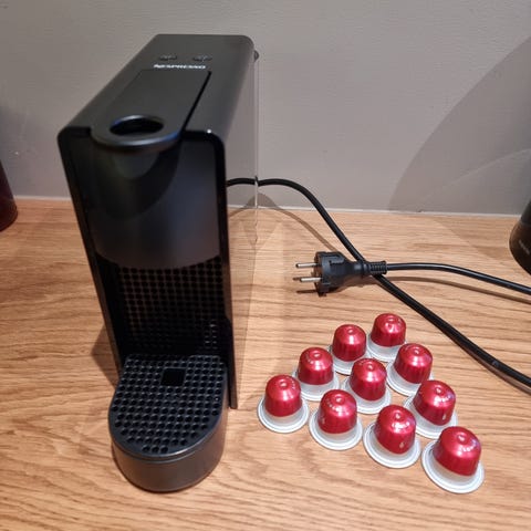 Nespresso Essenza Mini kapselkaffemaskin i hvit farge. Kompakt design for enkel bruk og plassbesparelse. Egnet for hjemmebruk eller kontor. Kapselholder hører med.