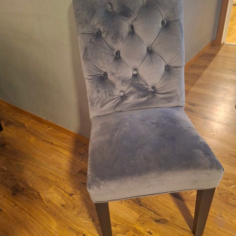 Veldig gode å sitte i. Myke og med en slags gynge effekt. Stolene var originalt i grått skinn, men pga slitasje har de nå grå stoltrekk. Selges grunnet nytt spisebord med stoler.
