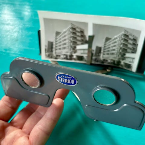 Vintage stereoskop for visning av tredimensjonale bilder. Enheten er laget av tre og har et håndtak for enkel bruk. Inkluderer flere gamle stereoskopbilder med ulike motiver.