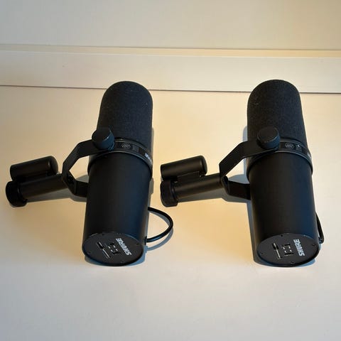 Shure SM7B. Mikrofonen er kjent for sin bruk i studioopptak og kringkasting. Den har en robust konstruksjon og er utstyrt med en innebygd popfilter for å redusere plosiver. Passer for profesjonell lydopptak og kringkastingsbruk.