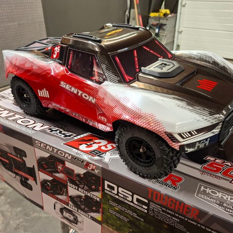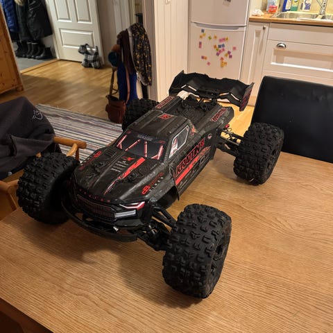 Selger min Arrma Kraton 6S (EXB-versjon?), en skikkelig beast av en 1/8-skala. Dette er en enorm bil på ca. 77 cm lang og over 10 kg, perfekt for bashing og offroad-moro. Den er brukt litt, men ikke veldig mye – mest lett kjøring uten store kræsj. Alt fungerer som det skal, inkludert motor, ESC og drivverk.