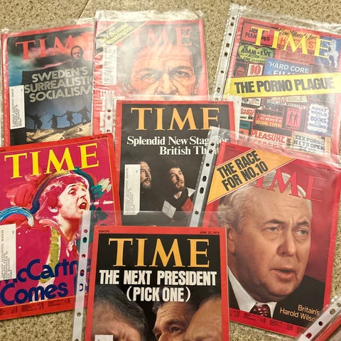 Samling av tidsskriftet Vår Tid med ulike fargede omslag.