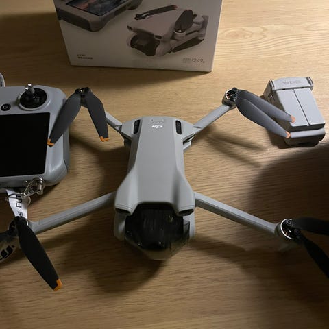 DJI Mini 3 drone med fjernkontroll DJI RC med skjerm. Leveres med to batterier, bæreveske, original eske og tilhører. Dronen er sammenleggbar for enkel transport og har kamera for foto- og videoinnspilling.