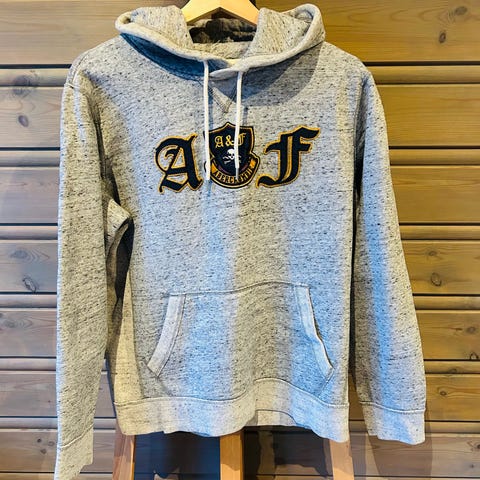 Abercrombie & Fitch hettegenser i blå farge, størrelse S (stor i størrelsen. Passer de fleste M), laget av bomull. Genseren har hette med snor og frontlomme