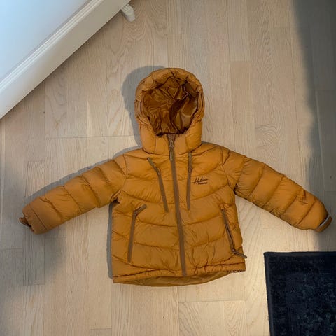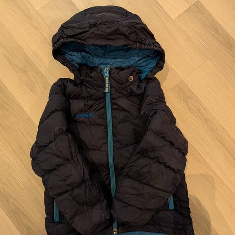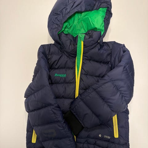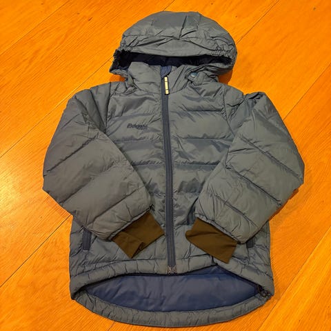 Bergans dunjakke for barn i størrelse 104. Jakken er blå og unisex, laget med dun som isolasjonsmateriale.