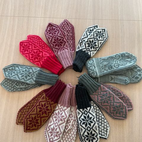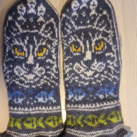 Håndstrikket votter av ull med katte motiv